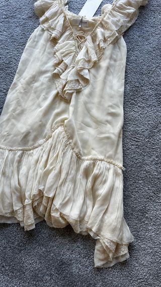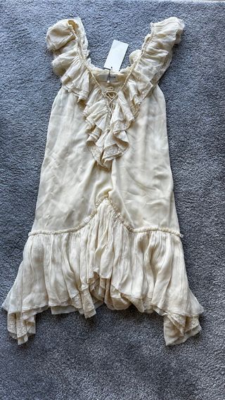 Precioso vestido midi de Zara en color crudo con detalle de volantes y tul bordado. Con vuelo y escote pico. Talla M