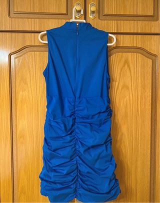 Vestido ajustado de Zara en color azul. Diseño moderno con fruncidos. - Sin mangas. - Cuello alto.