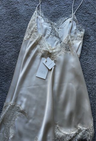 Precioso vestido midi de Zara en color beige blanco con detalle de encaje bordado. Tirante fino y bajo asimetrico. Super sexy. Talla S