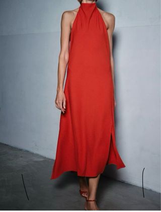Vestido largo de Zara, sin estrenar y con etiquetas. - Diseño halter. - Abertura lateral. - Color rojo vibrante.