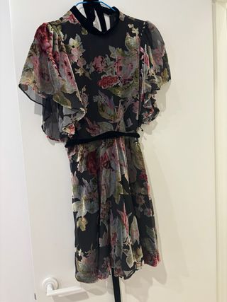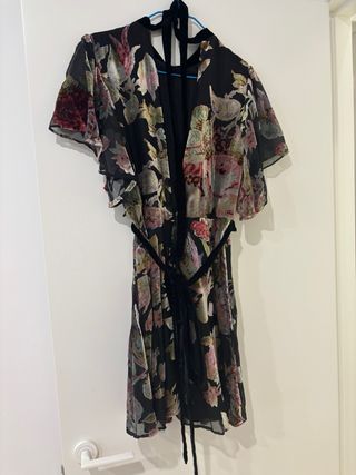 Vestido corto de Zara con un bonito estampado floral sobre terciopelo. - Diseño con cuello alto y mangas acampanadas. - Cinturón de terciopelo a juego. - Cierre con lazada en la nuca.