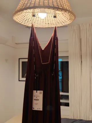 Vestido lencero largo de Zara Woman, color marrón burdeos, con tirantes de cadena dorada y detalles de cadena también en los laterales. ✨ Talla M ✨ Nuevo con etiqueta (PVP 79,95 €) ✨ Tejido fluido, caída preciosa ✨ Escote en V delante y detrás Queda espectacular puesto: elegante pero con punto sexy por los laterales abiertos. Ideal para eventos, cenas especiales o looks más arreglados. Estado impecable. Envío rápido. #zara #vestidolencero #vestidofiesta #nuevoetiqueta #cadena #tallam