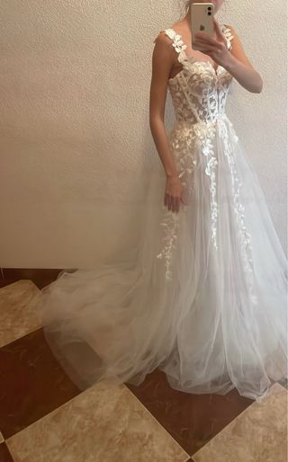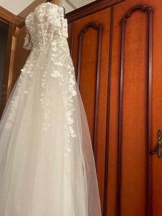 Vestido de novia de estilo romántico, con un diseño delicado y elegante. - Escote corazón con detalles de encaje. - Mangas cortas desmontables con aplicaciones florales. - Falda voluminosa con aplicaciones de encaje. - Espalda con cierre