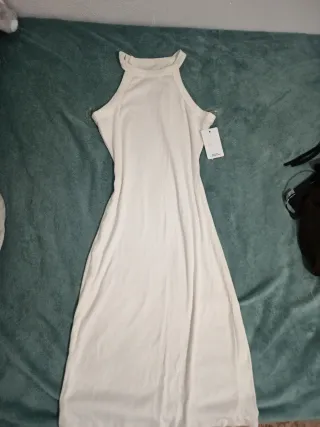 Vestido blanco de corte halter. - Tejido acanalado. - Largo midi.