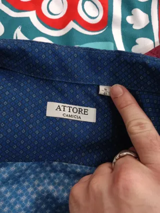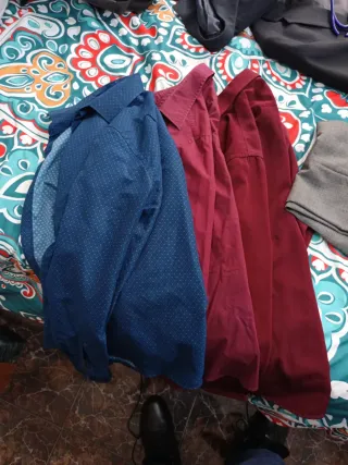 Conjunto de camisas de vestir para hombre. Incluye camisas en tonos azules y rojos. - Camisa azul con estampado de puntos. - Camisa roja lisa. - Camisa burdeos lisa.