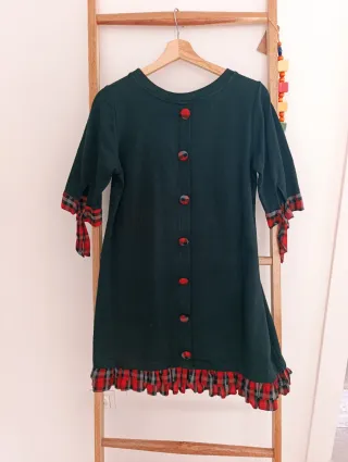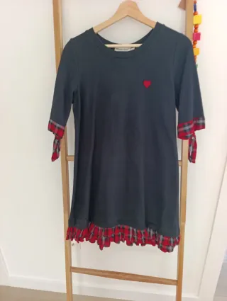 Vestido corto de manga tres cuartos con detalles a cuadros. Talla grande. - Adorno de corazón rojo bordado en el pecho. - Puños y bajo con volante de tela a cuadros. - Lazos en los puños.