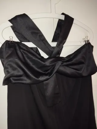 Vestido negro con un diseño sofisticado y un detalle de lazo. - Escote con lazo. - Tirantes cruzados. - Tejido satinado en el escote. - forrado Mide de largo, desde sisa a bajo, 83 cm.