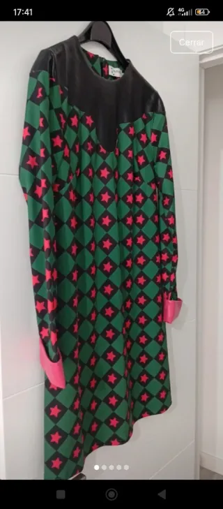 Vestido de la marca Minueto con un llamativo estampado. - Diseño con fondo verde y estrellas fucsias. - Cuello y mangas con detalle en negro. - Puños en color rosa fucsia.