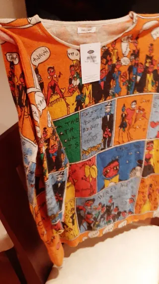 Vestido de punto con estampado de cómic y silueta oversize. Presenta un diseño vibrante y llamativo. - Estampado de cómic. - Corte oversize. - Cuello redondo.