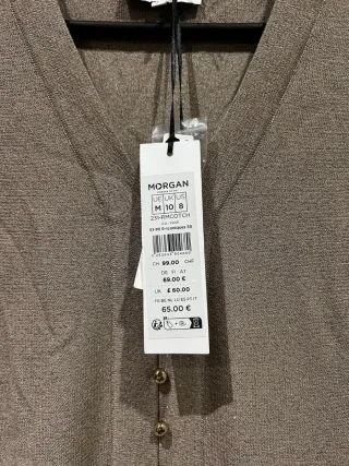 Vestido de punto de la marca Morgan en color marrón con un sutil brillo metalizado. Presenta un escote en pico y botones en la parte delantera. - Manga corta con vuelta. - Cintura marcada. - Tejido elástico.