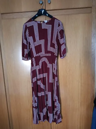 Vestido de corte midi con estampado geométrico en tonos burdeos y blanco. Presenta mangas cortas y cintura elástica. - Diseño geométrico. - Cintura elástica. - Largo midi.