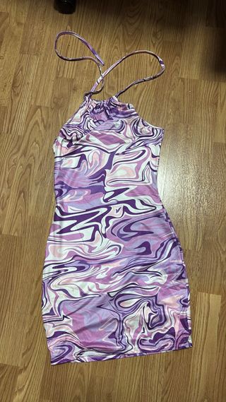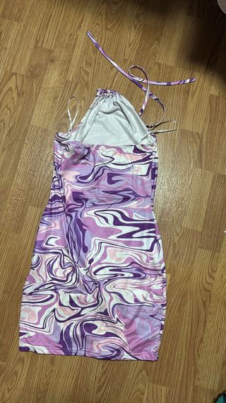 Vestido corto con un llamativo estampado abstracto. - Diseño tipo halter. - Tirantes finos. - Detalle fruncido en el lateral.