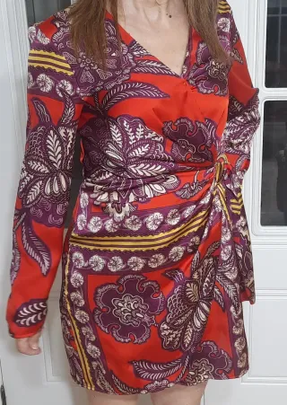 Vestido largo con un bonito estampado floral y detalles en rojo y ocre. Es talla única y sin estrenar. - Diseño con mangas largas. - Cintura elástica. - Largo hasta los tobillos con volante. - Detalle de borla en la cintura.