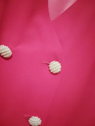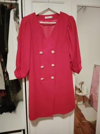 Vestido corto de color magenta con diseño cruzado y botones de perlas - Mangas abullonadas. - Cuello en V. - Largo hasta la rodilla.