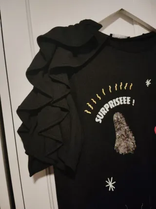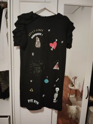 Vestido negro de algodón con un diseño original y divertido. - Mangas con volantes. - Estampados gráficos y texto. - Detalle de lentejuelas.