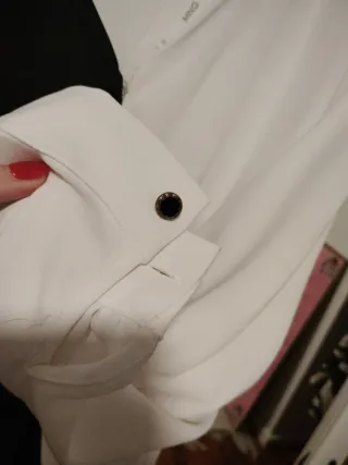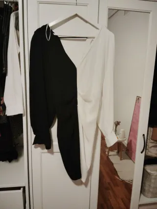 Vestido corto con diseño bicolor. - Manga larga. - Detalle fruncido en un lateral. - Cuello en V, un pelín descosido Le falta un botón