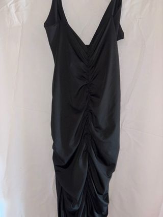 Elegante vestido negro con un diseño drapeado. - Tirantes finos. - Escote pronunciado. - Detalle de fruncido en la cintura. - Falda asimétrica.