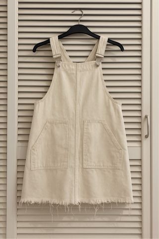 Vestido tipo peto vaquero en color blanco. Tiene un diseño moderno con bolsillos frontales y un acabado deshilachado en el bajo. Lo envío lavado y planchado!!! - Dos bolsillos grandes en la parte delantera. - Tirantes ajustables con hebillas metálicas. - Bajo deshilachado con flecos.