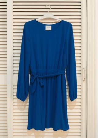 Vestido midi de manga larga en color azul. Presenta un diseño con cintura elástica y un lazo para anudar. - Manga larga abullonada. - Cintura elástica. - Incluye cinturón de tela a juego.