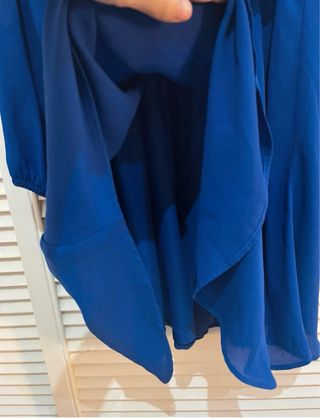 Vestido de fiesta con un diseño palabra de honor con tirantes finos. Falda con caída y capas. Color zul satinado con brillo. Talla 40. Incluye chaquetilla Medidas: 132cm de largo (desde el punto más alto del pecho hasta el bajo del vestido sin contar con las tirantas) 43cm de ancho axilas (desde la costura de una axila hasta la costura de la otra axila) 43cm de cadera.