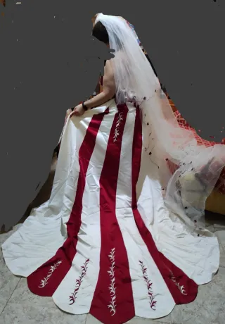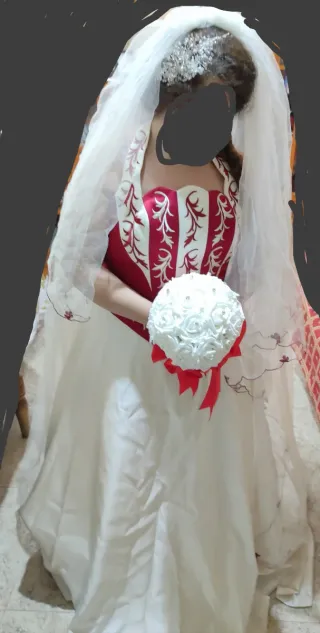 Conjunto de vestido de novia, velo, ramo y adorno para el pelo. - Vestido de novia con detalles en rojo y blanco. - Velo a juego con bordados. - Ramo de flores blancas con cintas rojas. - Adorno para el pelo a juego.