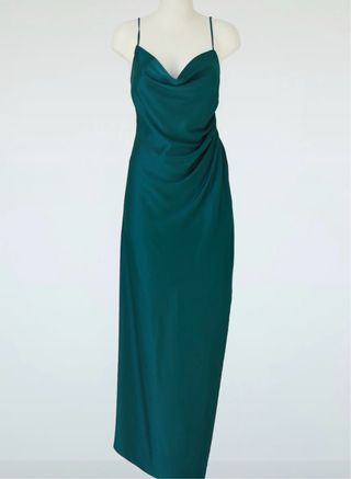 Elegante vestido midi de satén en un precioso color verde botella. Ideal para eventos. - Diseño con tirantes finos. - Escote drapeado. - Detalle fruncido lateral. - Ideal para nochevieja.