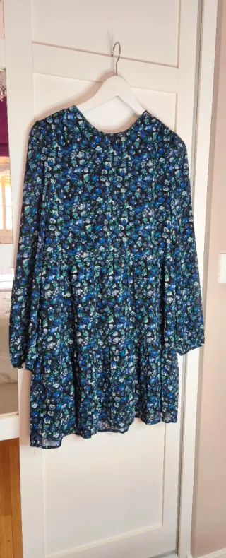 Vestido con estampado floral en tonos azules y negros. Presenta un diseño con varias capas y mangas largas. - Diseño de corte escalonado. - Mangas largas abullonadas. - Cuello redondo.