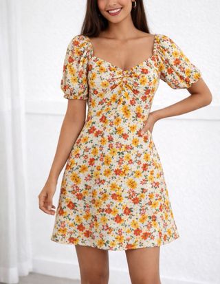 Vestido de talla S con un estampado floral vibrante. Es una prenda nueva, aún con su etiqueta original. - Diseño con escote en V y mangas abullonadas. - Detalle fruncido en el pecho. - Largo mini.
