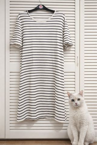 Vestido de manga corta con un diseño de rayas clásicas. Es una prenda cómoda y versátil. - Diseño de rayas horizontales. - Cuello redondo. - Manga corta.