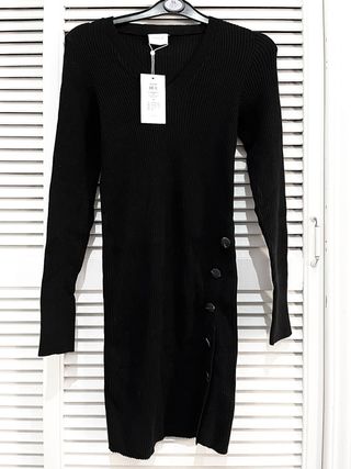Vestido midi de punto fino con cuello en pico y detalle de botones laterales. - Manga larga. - Corte ajustado. - Largo midi. - Nuevo con etiqueta.