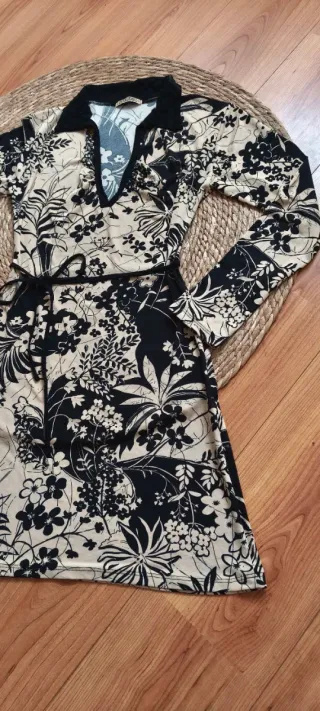 Vestido con un bonito estampado floral en tonos beige y negro. Presenta un diseño con cuello polo y cinturón. - Manga larga. - Estampado de flores y hojas. - Incluye cinturón a juego.