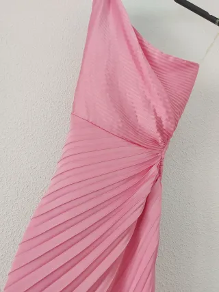 Vestido elegante de color rosa con un diseño plisado. - Tejido con textura de rayas finas. - Detalle de fruncido en el lateral. - Diseño asimétrico.