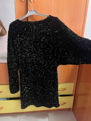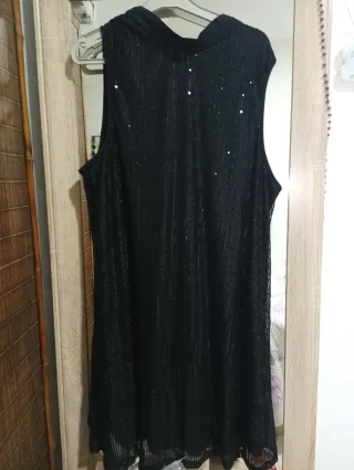 Vestido negro con lentejuelas brillantes, ideal para eventos especiales. - Diseño sin mangas. - Acabado con lentejuelas. - Largo hasta la rodilla.