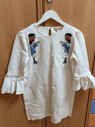 Vestido de Dolores Promesas con un diseño original. de color crema pongo fotos de medidas - Detalle de dos soldados con trompetas bordados en la parte delantera. - Mangas con volantes. - Cierre de botón en la espalda.