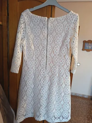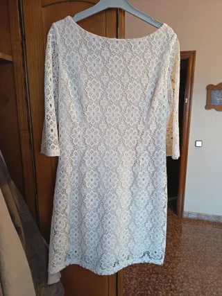Elegante vestido de satén con mangas largas de encaje. Para ocasiones especiales, como festividades, comuniones, bodas... El tacto es increíblemente suave y es elástico. Es una talla XS pero me está grande es un poco más grande (S) y no lo he podido usar, está para estrenar. - Tejido principal de satén brillante. - Mangas largas de encaje floral. - Escote cuadrado con detalle de lazada. - Ribete festoneado en el escote.