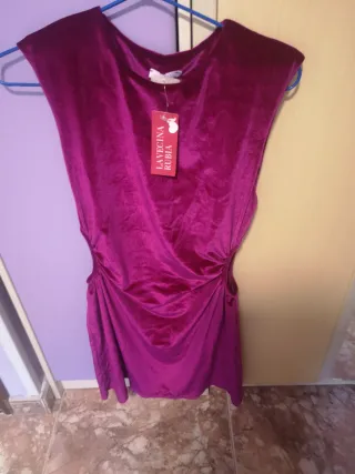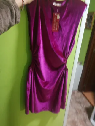Vestido de terciopelo en un vibrante color rosa magenta. Su diseño presenta un drapeado favorecedor en la cintura que crea una silueta elegante. - Tejido de terciopelo suave y brillante. - Drapeado lateral. - Corte moderno.