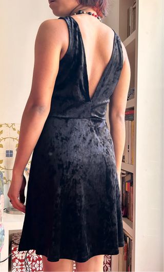 Elegante vestido de terciopelo negro con un diseño moderno. Muy versàtil. Como pongo en las fotos, puedes usarlo para una fiesta o bien para el día a día acompañado de un jersey o una chaqueta. - Tejido suave y brillante. - Corte favorecedor. - Ideal para eventos especiales.