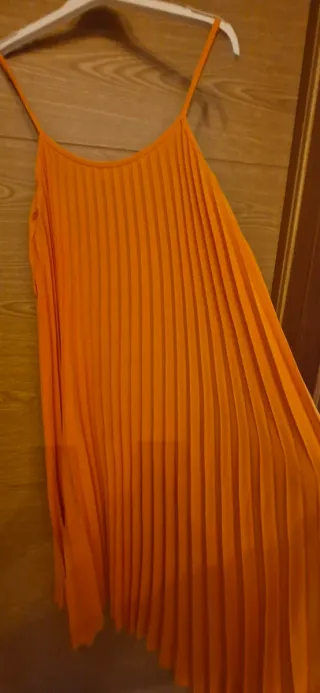 Vestido para el verano, con un precioso tono naranja y un diseño plisado. - Tirantes finos. - Largo midi. - Tejido ligero. - Da mucho juego a los accesorios que quieras usar. Sirve también como un L. Utilizado solo dos veces.