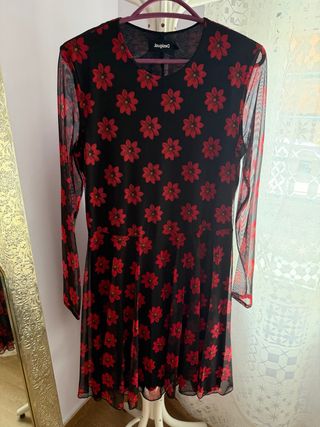 Vestido de manga larga con un estampado flores rojas, manga transparente. Como nuevo, usado una o dos veces.