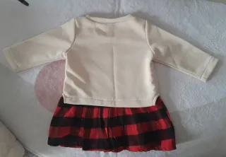 Vestido de manga larga con estampado navideño. Talle 6-9 meses. - Parte superior en color beige con dibujo de reno y Merry. - Falda a cuadros rojos y negros.