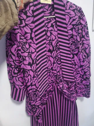 Vestido largo de estilo retro en tono morado. Presenta un diseño elegante con detalles fruncidos y aperturas laterales con volantes. En las fotos se ve el color muy mal pero es morado berenjena.🍆 Es una talla Xs pero no me vale es un poco más estrecha , es para chicas delgaditas. Es para estrenar. Sin ningún uso. - Mangas largas transparentes. - Escote cuadrado con tirantes. - Fruncido en la zona del torso. - Volantes decorativos en el bajo.