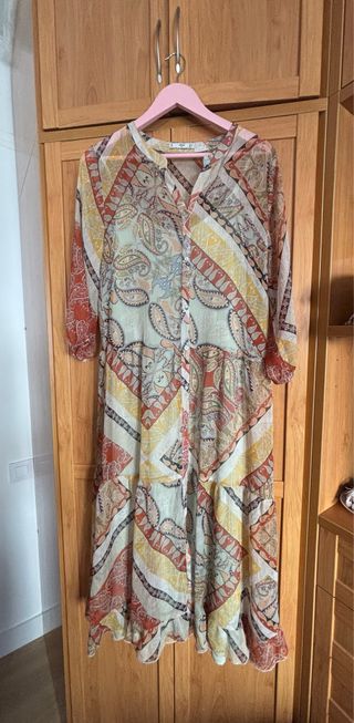 Vestido con un bonito estampado paisley en tonos beige y multicolor. Tiene manga larga y cinturón. - Estampado paisley. - Manga larga. - Cinturón a juego.