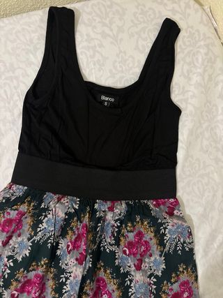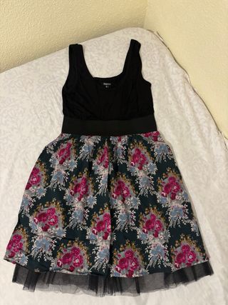 Vestido con corpiño negro y falda estampada. - Corpiño de manga corta. - Cintura elástica. - Falda con estampado floral. - Detalle de tul en el bajo.