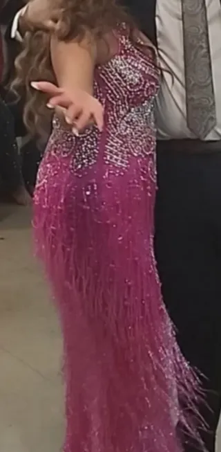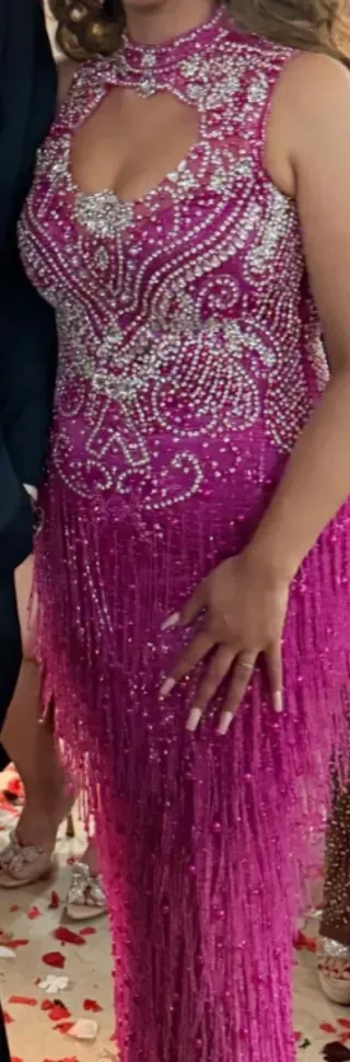 Vestido largo con un diseño espectacular de pedrería y flecos. - Cuerpo con escote y detalles de pedrería plateada. - Falda con flecos de canutillo que aportan movimiento. - Color fucsia vibrante con adornos plateados.