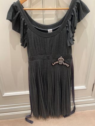 Vestido de punto gris con detalles de volantes en las mangas y falda plisada. Presenta un aplique decorativo en la zona del pecho. - Mangas con volantes. - Falda plisada. - Aplique LOVE IS LOVE con corona.