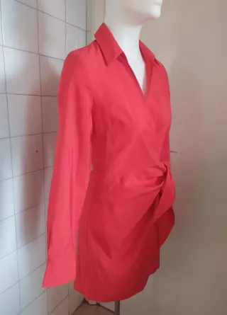 Vestido de corte cruzado con detalle de lazo. Tipo kimono y entallado. - Manga larga y puño con abertura - Cuello camisero. - Tejido ligero mezcla viscosa y poliéster Medidas: ancho: 46cms, hombro: 39cms, cintura: 34cms (ajustable con cintas), manga: 62cms (incluye puño de 7,5cms), ancho puño: 10cms Sin uso, impecable y en perfecto estado, ver fotos.