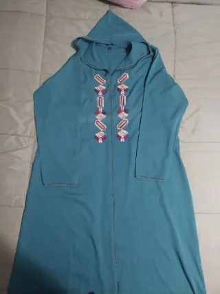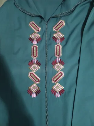 Vestido de estilo marroquí con un diseño bordado en la parte frontal. Es una prenda cómoda y versátil. - Bordado decorativo en el pecho. - Diseño con capucha. - Costuras visibles en puños y frontal.