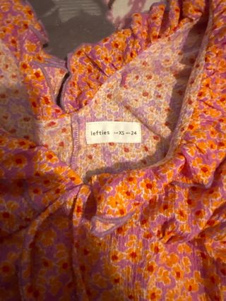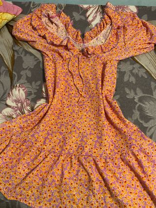 Vestido de verano con estampado floral en tonos rosas y naranjas. Presenta un escote con volantes y cordones para ajustar. - Diseño con volantes en el escote. - Mangas cortas abullonadas. - Cintura con cordón. - Falda con vuelo y volante.