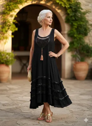 Elegante vestido largo para mujer con un llamativo estampado. - Diseño con forro interior. - Detalle de borlas negras en el bajo.