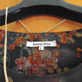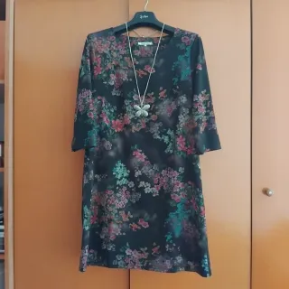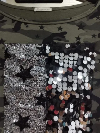 Vestido con estampado de camuflaje y detalle de lentejuelas plateadas y negras. De corte recto. Con cinturon negro ancho queda muy bien.